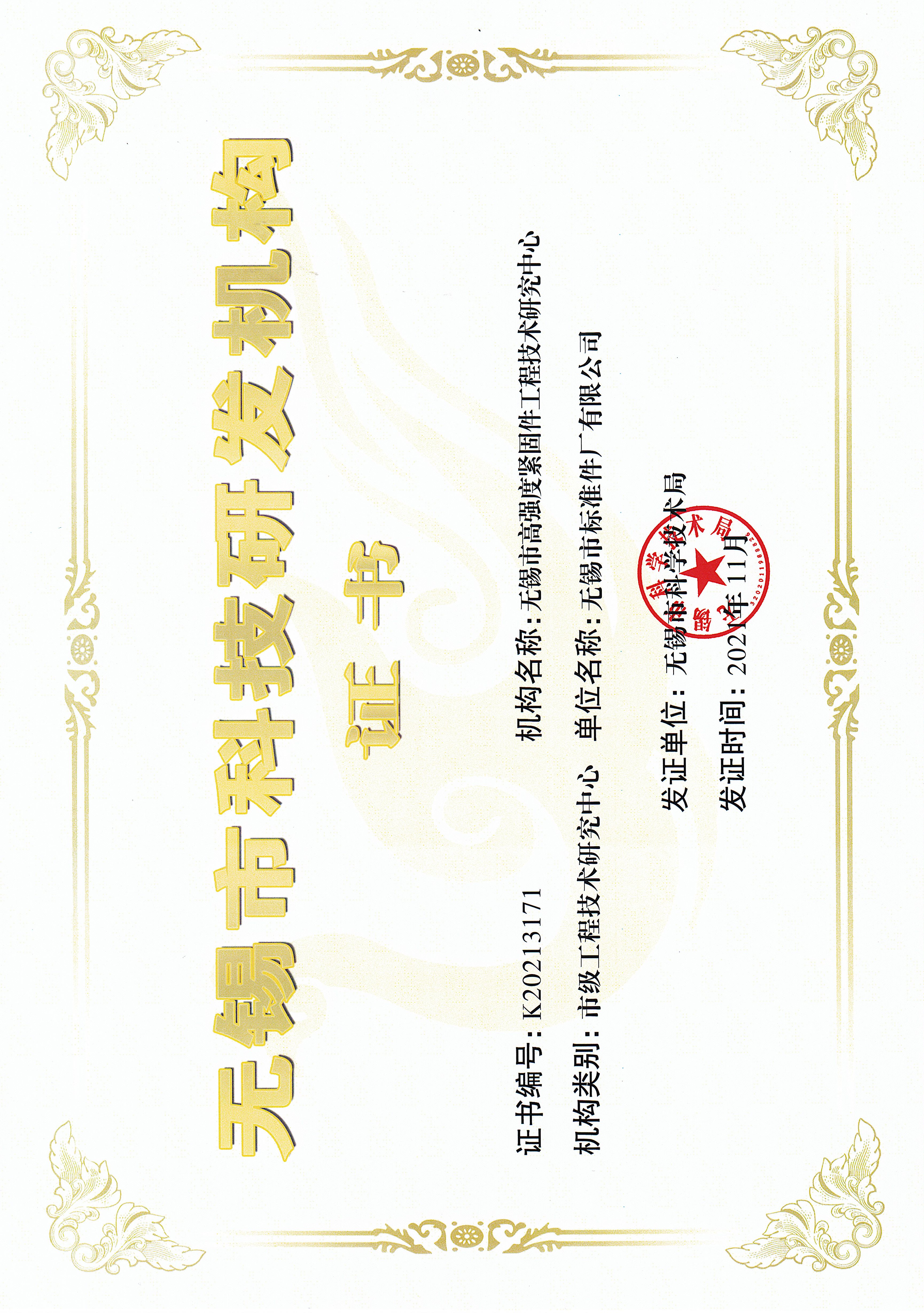 无锡市企业技术中心认定证书.